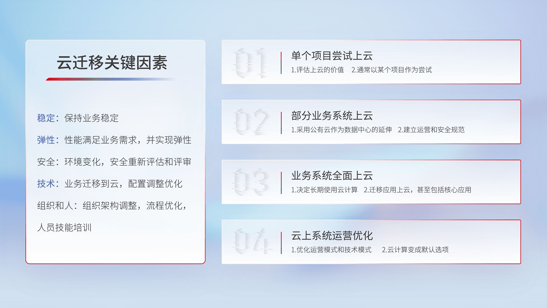结合实际业务,,,从规划设计、、云平台选型、、云原生改造、、数据迁移、、集成交付,,,,迁移全过程为客户识别最佳上云路径,,,做好风险识别管理,,,,设计网络架构、、身份权限、、、安全审计合规、、、、操作审计、、、日志审计、、、、监控告警策略、、、多站点容灾设计等,,,,对云上基础设施进行整体规划,,,,提升IT治理水平,,,,以满足弹性、、、高可用、、、、高性能的需求。。。。