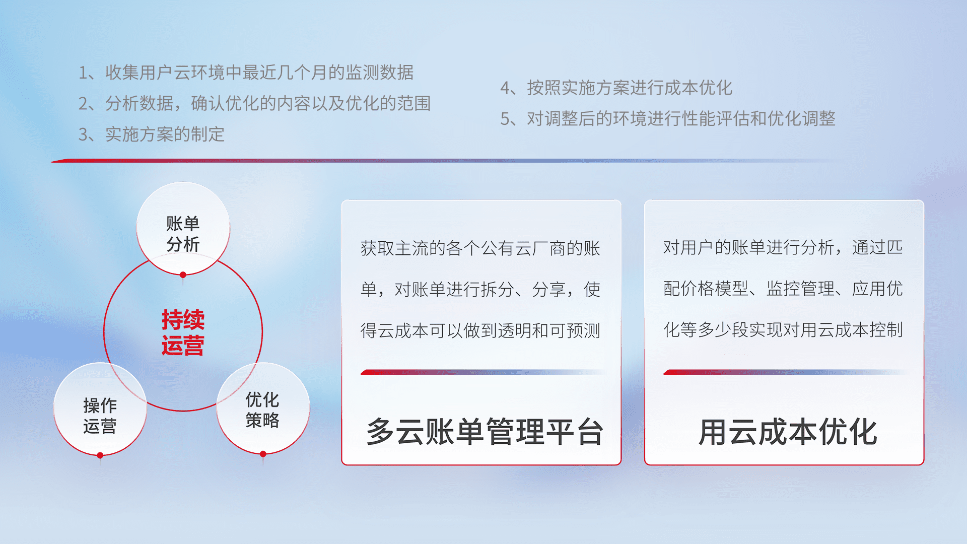 通过多云纳管,,,以统一的资源数据模型把客户的云资源进行抽象和封装,,进而实现对多云资源的统一操作,,,,保障云资源管理的可靠性、、、稳定性与可用性。。。。量身定制化运维内容,,配置、、开发运维、、、、补丁管理、、、、备份、、监控、、、、认证和访问管理、、、审计和日常巡检等,,,保障在用云过程中的可靠度,,,稳定度以及高可用率。。。